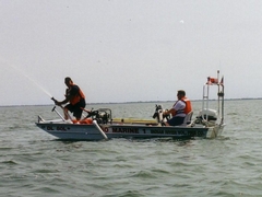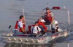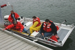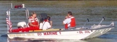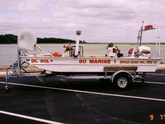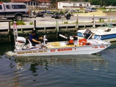 80 Marine Unit #1 has a 35 HP Johnson outboard motor, rescue platform, portable pump with foam pack, full backboard, and GPS navigation equipment. It is AED equipped.