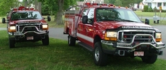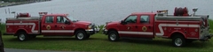 These Brush Trucks are 1999 Ford F350, 4-door, 4x4s, with each having a 7.5 diesel engine, automatic transmission, fiberglass Fibre utility bodies, including a 250 GPM pump with a separate engine, and a 200 gallon tank. These units each carry 1 ¾” fire suppression hose and forestry booster lines as well as 3” supply hose. These units have a 10,000 pound front mounted Superwinch and are AED equipped.