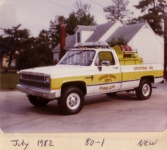 In July of 1982, our new Chevrolet 4x4 Brush Truck arrived. It arrived in an all white paint job. A lime-yellow stripe and lettering were soon added.